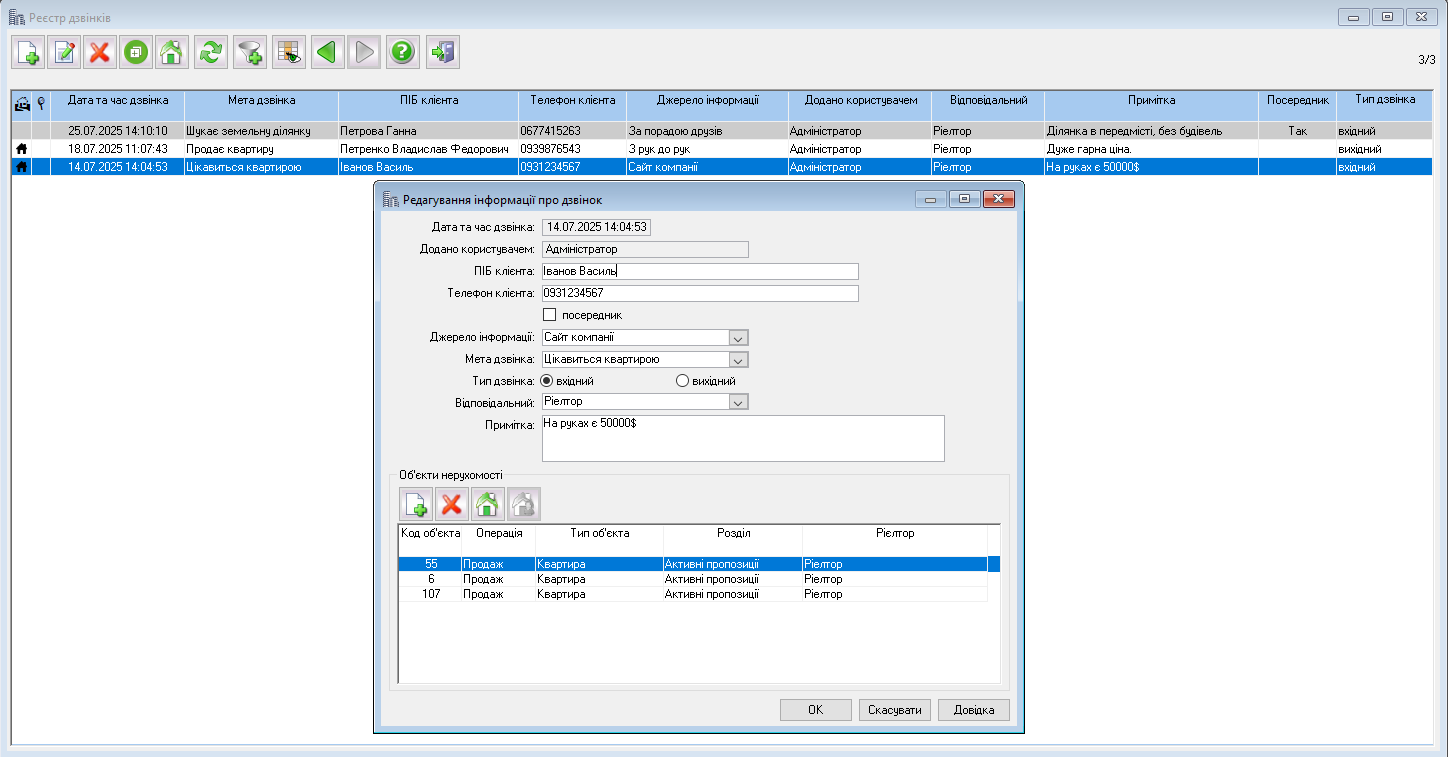 Здійснюйте дзвінки прямо зі списку об’єктів нерухомості за допомогою прямого зв’язку з сервером ip-телефонії Вашого офісу (на базі Asterisk або Binotel). При вхідному дзвінку відразу буде підніматися картка клієнта і Ви будете розуміти, з ким Ви говорите, і бачити, які об’єкти та заявки в базі є від клієнта.